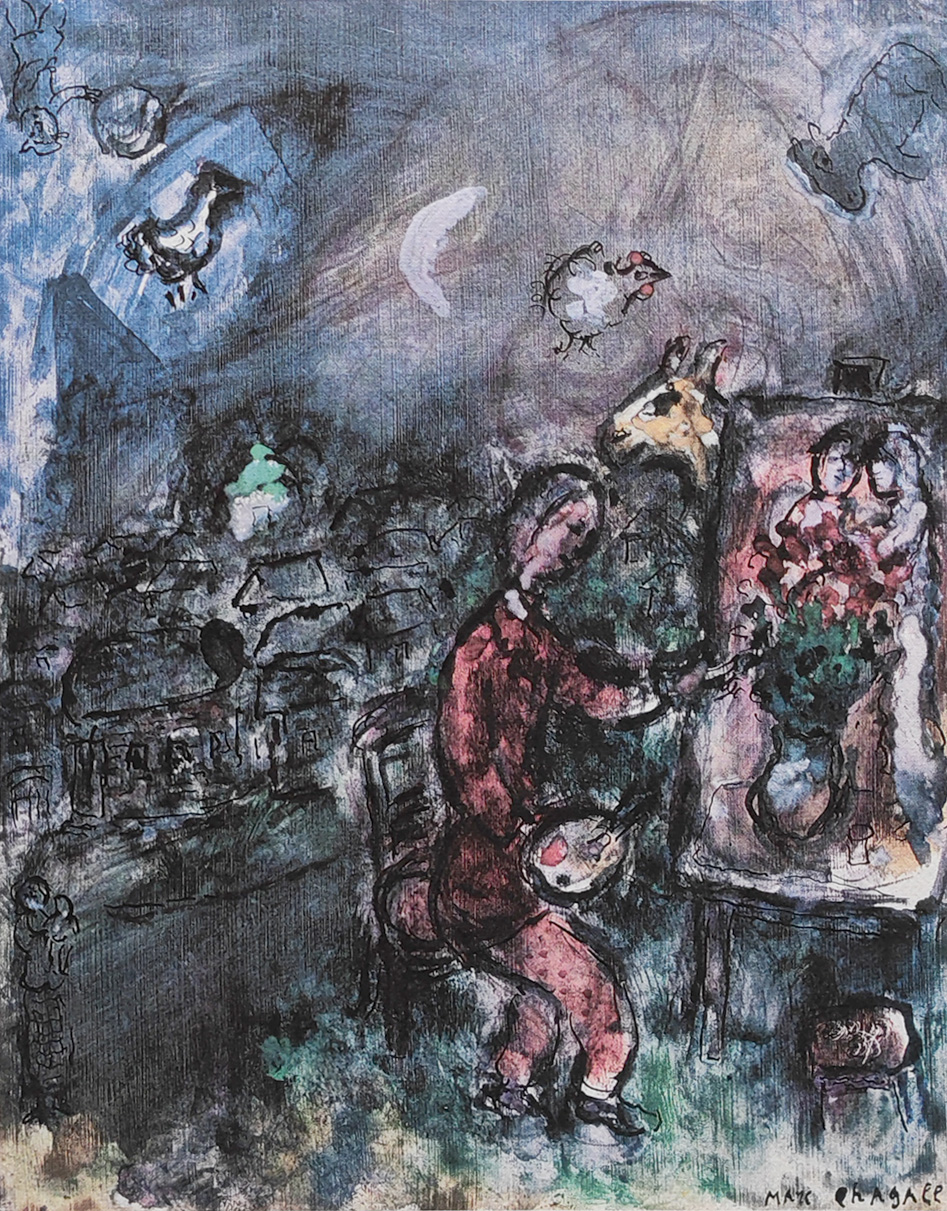 Marc Chagall (1887-1985) – francuski malarz i grafik pochodzenia rosyjskiego. Wybitny przedstawiciel École de Paris. Rysunku uczył się u witebskiego malarza Juda Pen. W 1907r. rozpoczął studia w Akademii petersburskiej .W latach 1910-1914 przebywał na stypendium w Paryżu, gdzie zetknął się z kubizmem i zaprzyjaźnił z G. Apollinairem i M. Jacobem. W 1915r. ożenił się z Bellą , była ona muzą wielu jego obrazów. W 1919r. był kierownikiem artystycznym Państwowego Teatru Żydowskiego w Moskwie. Od 1947r. mieszkał na stałe w Paryżu. Po naiwno-realistycznych obrazach w początkowej twórczości, uległ wpływom kubizmu, ekspresjonizmu i surrealizmu. W jego obrazach przeważa pogodna tematyka miłosna, pejzaże, sceny religijne. Charakterystycznymi dla niego środkami wyrazu są m.in. deformacja kształtów, zachwianie proporcji, przewaga żywych czerwieni, błękitów i zieleni.