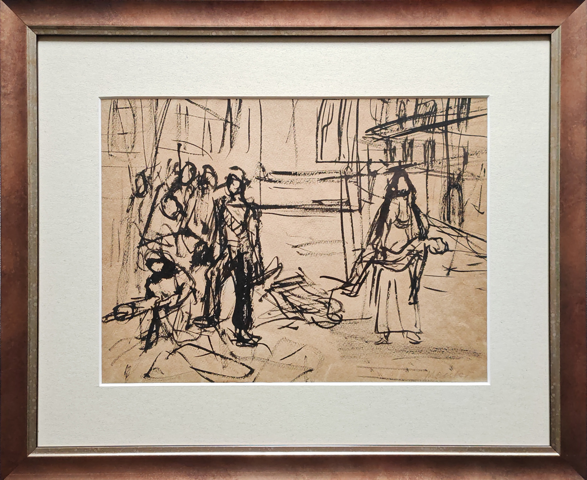 Prezentowana praca to przykład swobodnego szkicu tuszem, w którym artysta operuje dynamiczną, zdecydowaną kreską, budując scenę figuralną o dużej sile wyrazu. Zarys postaci i architektury potraktowany został syntetycznie, niemal kaligraficznie, co podkreśla spontaniczność i szkicowy charakter kompozycji.