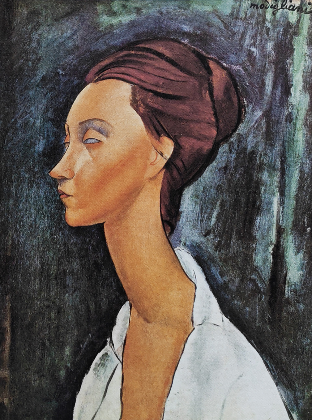 trzydziestopięcioletni życiorys pełen jest gwałtownych miłosnych uniesień, rozpustnego, przepełnionego alkoholem i narkotykami życia w artystycznych dzielnicach Paryża, czy nieustających problemów zdrowotnych, jego dzieła, może poza rozedrganą czasami tkanką malarską, cechują spokój i równowaga. Powracając pamięcią do rodzinnych Włoch, Modigliani wykorzystuje w swoich pracach dziedzictwo antyku, renesansu i manieryzmu. Doskonałe, statyczne kompozycje, nienaganny rysunek oraz wystudiowane, “manierystyczne” pozy zaburzonych w proporcjach modelek, to zestaw cech charakteryzujących prace podejmujące główny temat jego dzieł – portrety oraz akty. Pomimo tak głębokiego zamiłowania do sztuki Europy Zachodniej, Modigliani uległ również urokowi podziwianej w owych czasach sztuki prymitywnej – w szczególności maskom afrykańskim, których własności odnaleźć można w syntetycznych ujęciach portretowanych osób.
