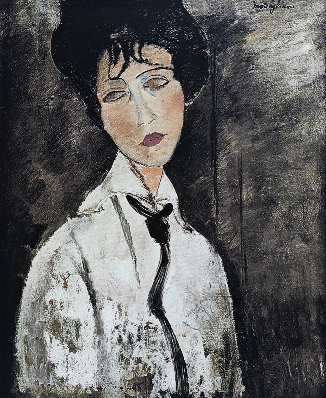 trzydziestopięcioletni życiorys pełen jest gwałtownych miłosnych uniesień, rozpustnego, przepełnionego alkoholem i narkotykami życia w artystycznych dzielnicach Paryża, czy nieustających problemów zdrowotnych, jego dzieła, może poza rozedrganą czasami tkanką malarską, cechują spokój i równowaga. Powracając pamięcią do rodzinnych Włoch, Modigliani wykorzystuje w swoich pracach dziedzictwo antyku, renesansu i manieryzmu. Doskonałe, statyczne kompozycje, nienaganny rysunek oraz wystudiowane, “manierystyczne” pozy zaburzonych w proporcjach modelek, to zestaw cech charakteryzujących prace podejmujące główny temat jego dzieł – portrety oraz akty. Pomimo tak głębokiego zamiłowania do sztuki Europy Zachodniej, Modigliani uległ również urokowi podziwianej w owych czasach sztuki prymitywnej – w szczególności maskom afrykańskim, których własności odnaleźć można w syntetycznych ujęciach portretowanych osób.