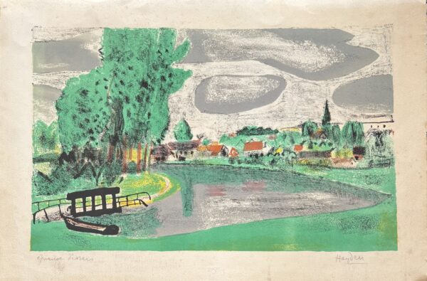 Widok spokojnego miasteczka nad wodą: łukowaty brzeg stawu, mały mostek i łódź na pierwszym planie, w głębi pas zabudowy z czerwonymi dachami i smukłą wieżą kościoła. Syntetyczne plamy zieleni, szarości i żółci oraz swobodny, szkicowy kontur budują lekko impresyjny charakter kompozycji – typowy dla pejzaży Haydna z okresu École de Paris, w których artysta łączył dekoracyjność koloru z lapidarnym rysunkiem.