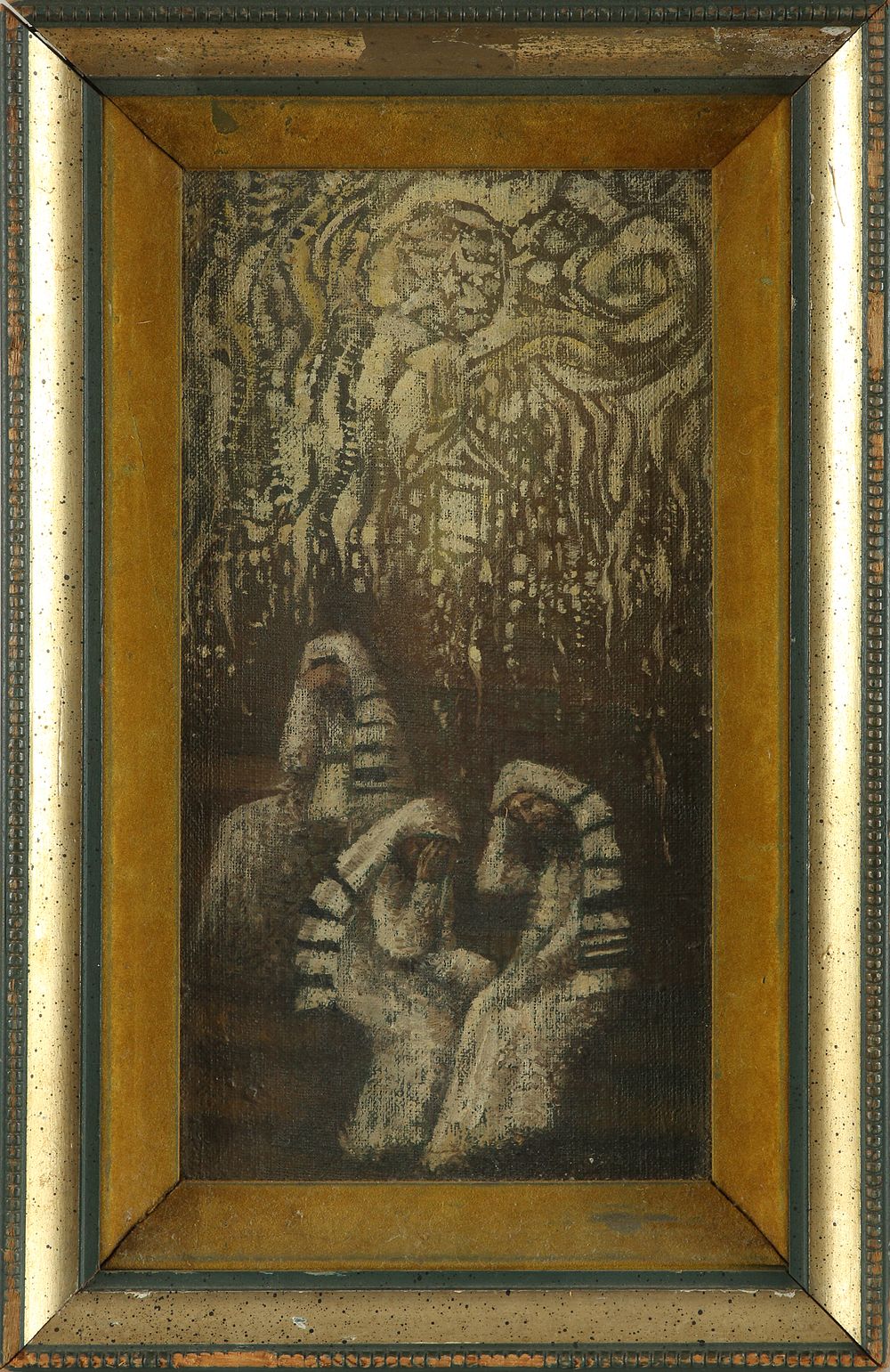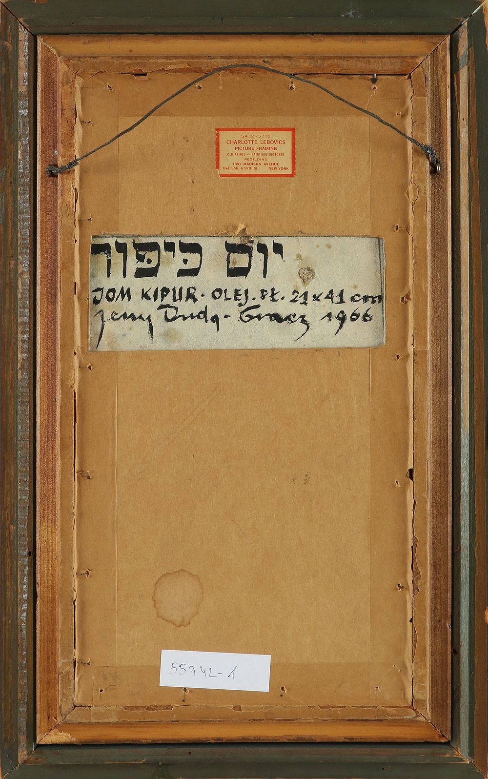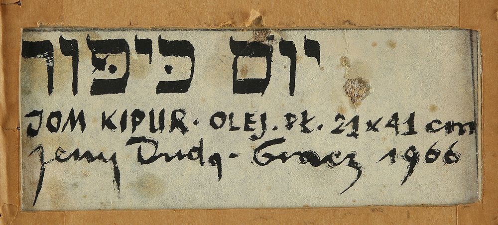 Sygn. i dat. na odwrocie; na odwrocie także autorski opis z tytułem („JOM KIPUR… 21×41 cm… 1966”) oraz napis w alfabecie hebrajskim.